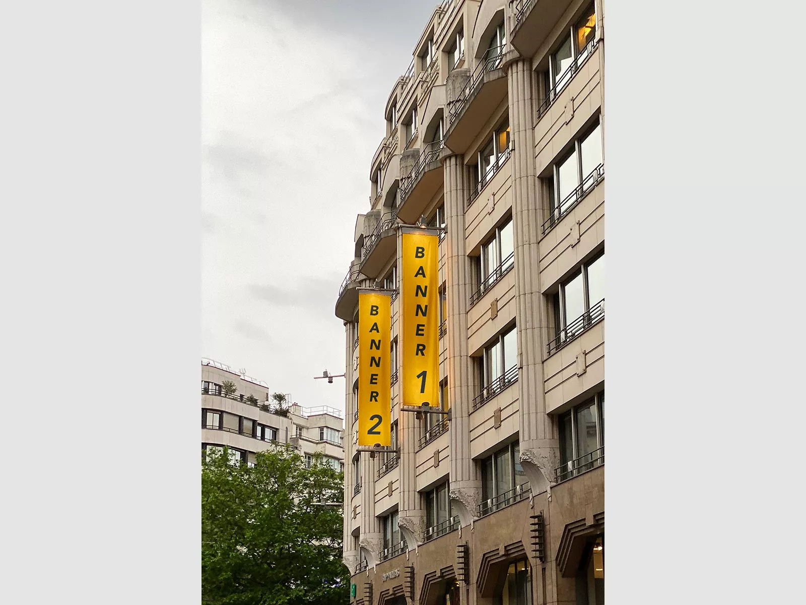 Home › Flag Mockups › Two Vertical Banner Flag Mockups on a Building › Two vertical banner flag mockups on a building